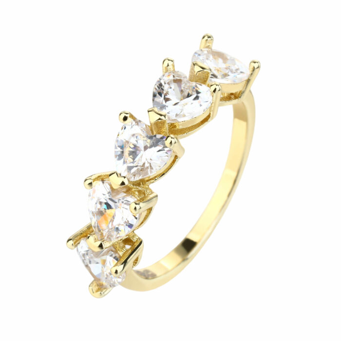 טבעת כסף 925 בצבע זהב מרהיבה בעיצוב יוקרתי עם שורת אבני זירקון בצורת לב, כל אחת משובצת בקפידה ומפיצה אור ייחודי.