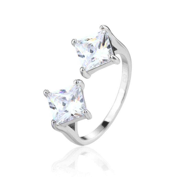 טבעת כסף 925 בעיצוב פתוח ויוקרתי, המשובצת בשתי אבני זירקון מרובעות גדולות, נוצצות ומדויקות.