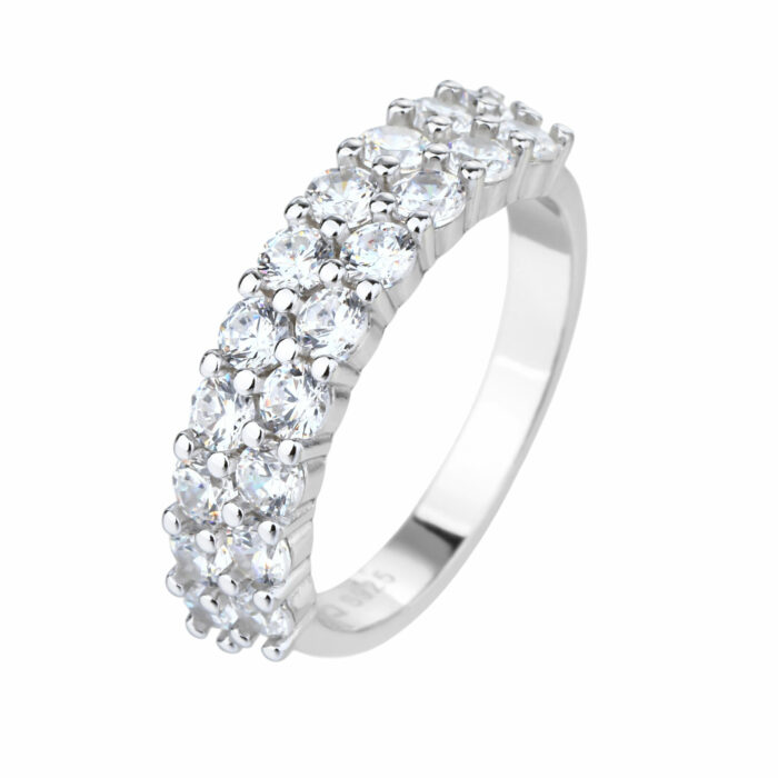 טבעת כסף אלגנטית ומרשימה, משובצת בשתי שורות של אבני זרקון עגולים בוהקים, המעניקים לה מראה נוצץ ויוקרתי. העיצוב המדורג מוסיף עומק וזוהר לכל תנועה של האצבע. טבעת מושלמת למראה יומיומי עם נגיעת יוקרה, או כתכשיט חגיגי לאירועים מיוחדים