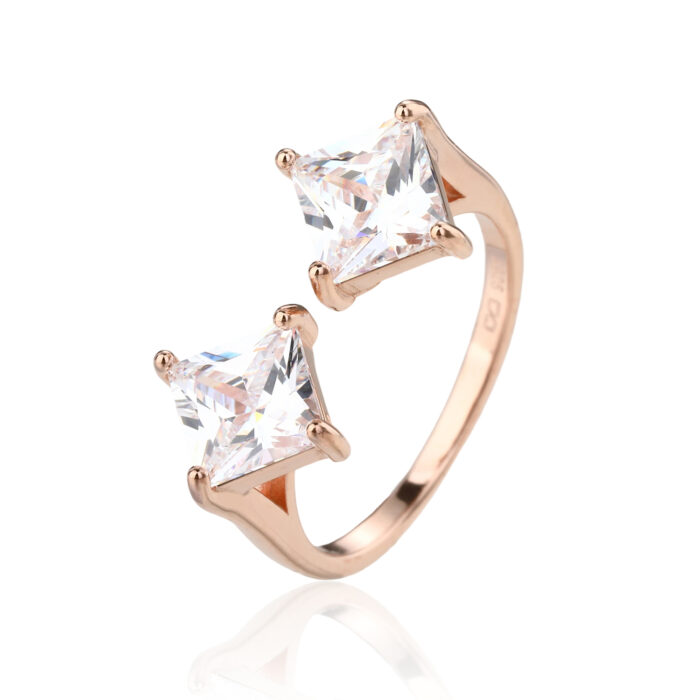 טבעת כסף 925 בצבע רוז גולד בעיצוב פתוח ויוקרתי, המשובצת בשתי אבני זירקון מרובעות גדולות, נוצצות ומדויקות.