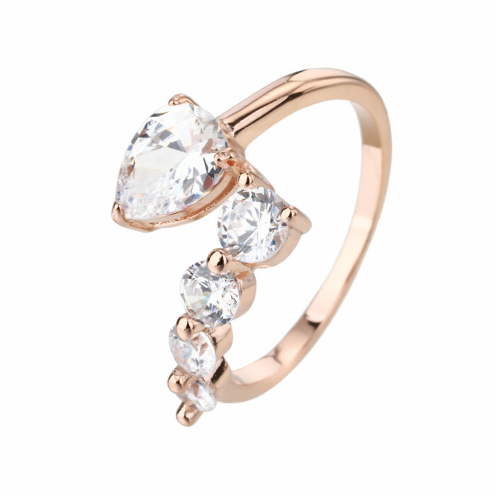 טבעת כסף 925 בצבע רוז גולד ובעיצוב פתוח ונשי, המשובצת בשורת אבני זירקון בוהקות ובאבן מרכזית בצורת טיפה – כמו טל זוהר על פרח בבוקר.