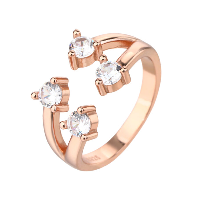 טבעת כסף 925 בצבע רוז גולד מעוצבת בעדינות מרהיבה, עם ארבע אבני זירקון נוצצות המשובצות על מבנה כפול ומעוגל בעדינות.