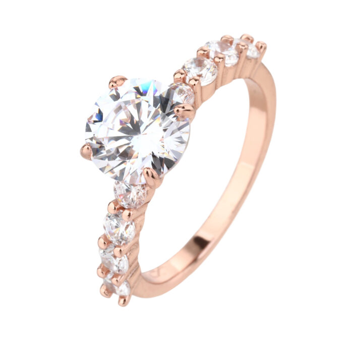 טבעת כסף 925 בצבע רוז גולד קלאסי ונוצצת, בעיצוב אלגנטי עם אבן מרכזית גדולה ומרהיבה, המשובצת באבני זירקון קטנות לאורך הטבעת.