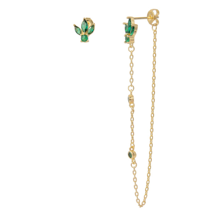 עגילי כסף מעוצבים בא-סימטריה ייחודית: בצד אחד שיבוץ ירוק בעיצוב פרחוני עם אבני זרקון ירוקות; בצד השני אותו שיבוץ מחובר לשרשרת עדינה עם שתי אבני זרקון ירוקות קטנות. מראה טרנדי, צעיר ובעל טאץ' ירוק בולט.