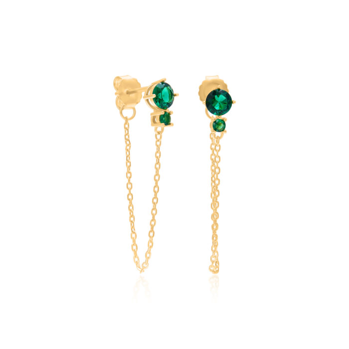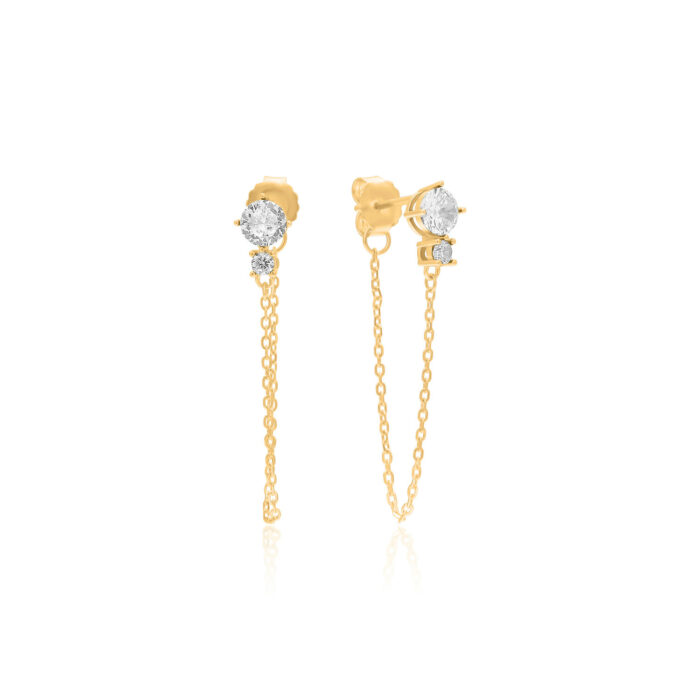 עגילים צמודים בצבע צהוב עם אבני זרקון שקופות. בעגיל אחד יש אבן גדולה ושרשרת עדינה שתלויה ממנה, ובעגיל השני יש אבן גדולה נוספת עם שרשרת מחוברת לנקודה נמוכה יותר. עיצוב עדין, מודרני ואלגנטי.