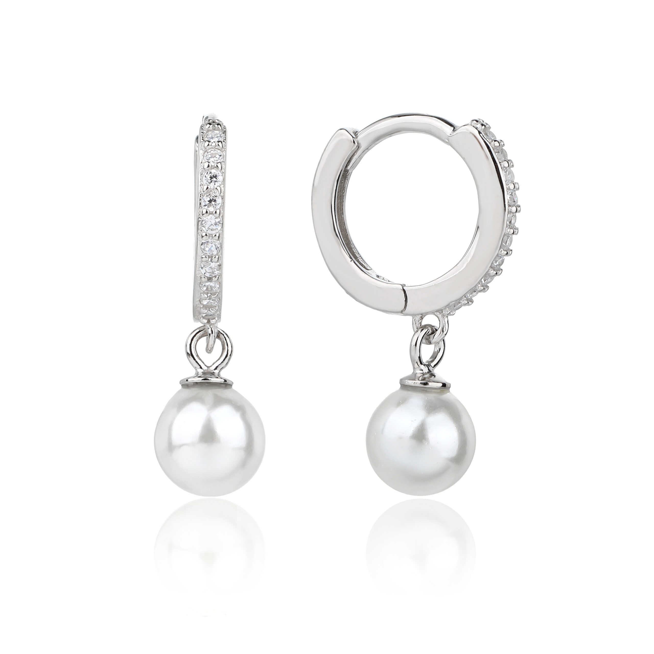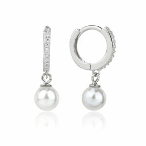 חישוק כסף מעוטר בזירקונים עדינים, ומהם תלויה פנינה מושלמת שמוסיפה רכות, נשיות ויוקרה טבעית בכל תנועה.