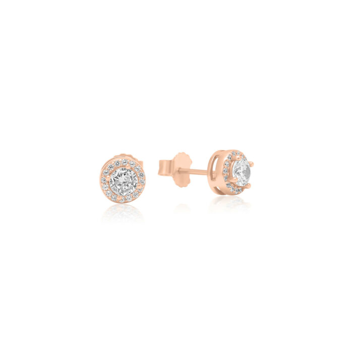 עגילי כפתור קלאסיים בגוון רוז גולד, משובצים בזירקונים נוצצים בליטוש עגול. האבן המרכזית בולטת ומוקפת הילה זוהרת שמעניקה מראה יוקרתי ונוצץ. מושלמים ליום-יום או לאירוע מיוחד – שילוב אלגנטי על-זמני שמוסיף ברק לכל הופעה.