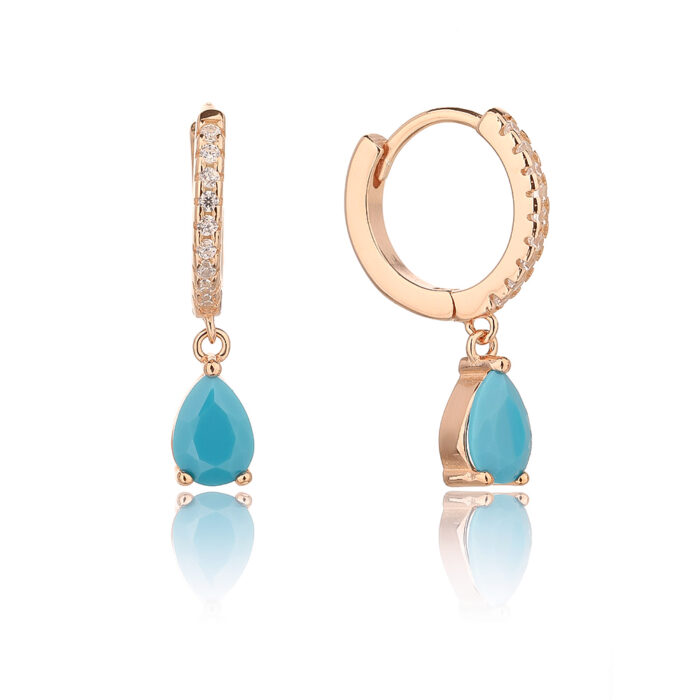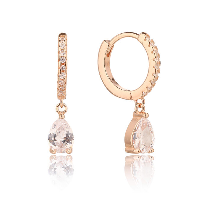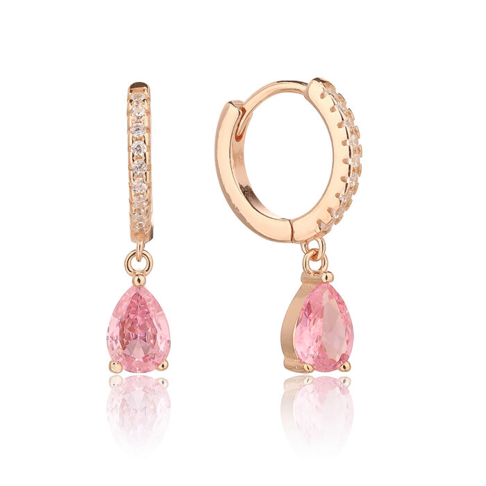 עגילי חישוק מזהב ורוד, עם שורה של אבני חן קטנות לאורך החישוק, ועם תליון של אבן חן שקופה בצורת טיפה תלויה בתחתית. עגילים אלגנטיים ועדינים שמתאימים לאירועים חגיגיים או להוספת נגיעה מיוחדת לסטייל היומיומי.