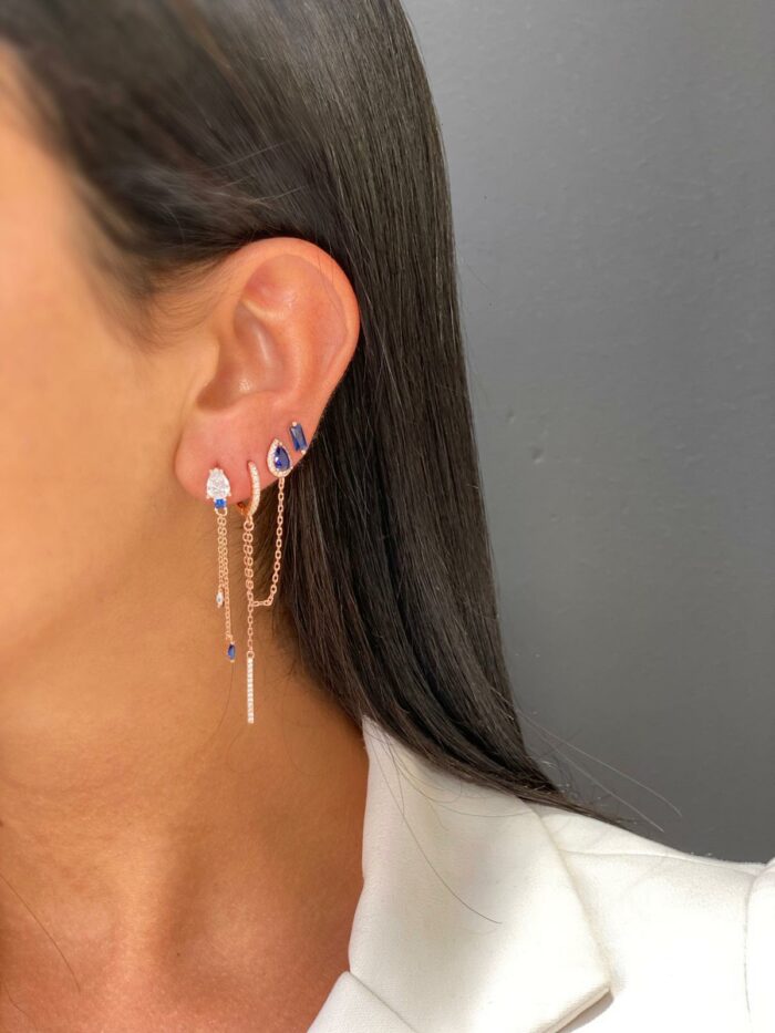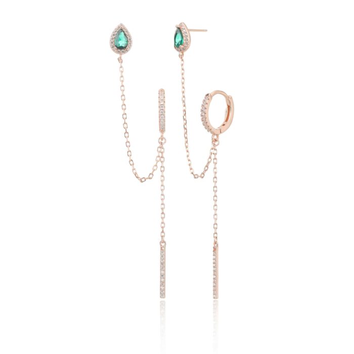 עגילים תלויים מזהב ורוד משובצים אבני זרקון נוצצות בעיצוב מודרני ואלגנטי. כל עגיל מורכב מפיסת טיפה עם הילה נוצצת, המחוברת בשרשרת עדינה לעגיל חישוק מעוטר אבנים. שילוב מושלם של זוהר ועדינות לסטייל ייחודי ומרשים, שישדרג כל הופעה באור רך וזוהר בלתי נשכח.