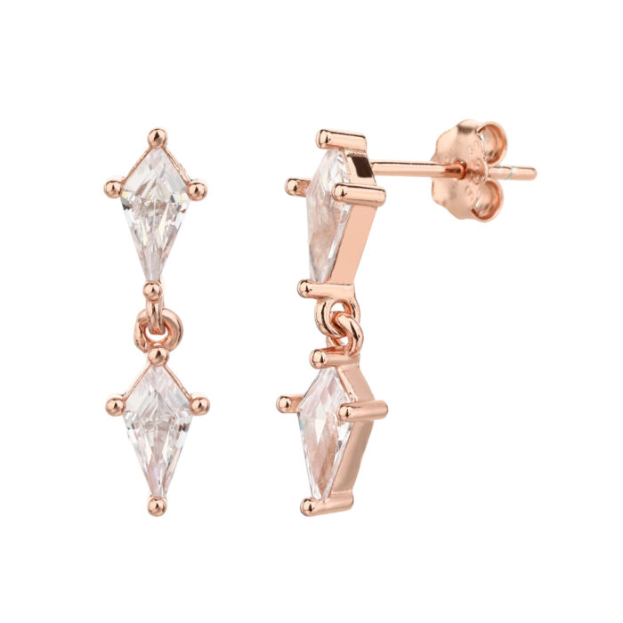 עגילי כסף אלגנטיים בעיצוב תלוי – שני אבני זירקון מלוטשות בצורת יהלום מוארך, משובצות בעדינות במסגרת כסף מבריקה. העגילים משדרים יוקרה ותחכום, מתאימים הן למראה יום-יומי אלגנטי והן לערב מיוחד. סגירת פרפר נוחה מאחור להרגשת ביטחון ונוחות מירבית.