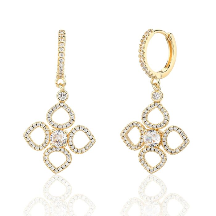 עגילי תלייה בציפוי זהב יוקרתי, בעיצוב פרח מרהיב המשובץ באבני זירקון נוצצות מכל צד.