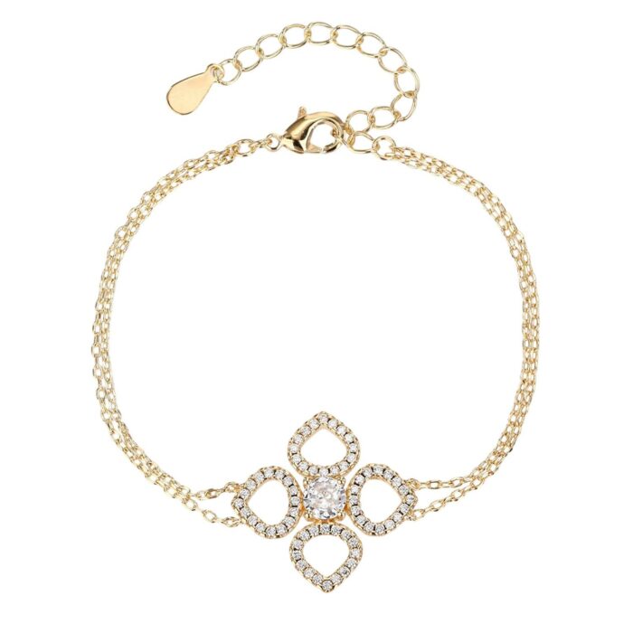 מיד עדין ומרשים מכסף 925,בצבע זהב ובעל שרשרת כפולה דקה המשולבת בתליון מרכזי בעיצוב פרח ייחודי. ארבעת עלי הכותרת מעוצבים בצורת טיפה פתוחה, משובצים באבנים קטנות, כשבמרכזם אבן נוצצת עגולה להשלמת המראה. הצמיד כולל שרשרת הארכה וסוגר נוח, ומתאים למראה חגיגי או מתנה מרגשת