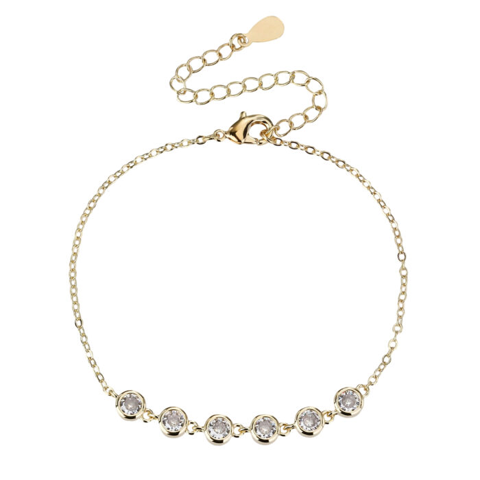 צמיד כסף 925 בצבע זהב ובעיצוב קלאסי ונשי, עם שורת אבני זירקון עגולות המשובצות בקפידה ומעניקות ברק אלגנטי ונוצץ.