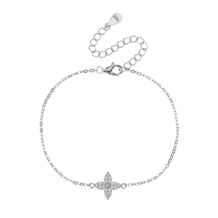 צמיד כסף 925 בעיצוב אלגנטי עם תליון בצורת פרח עדין, משובץ באבני זירקון קטנות ונוצצות שמפזרות אור מכל זווית.