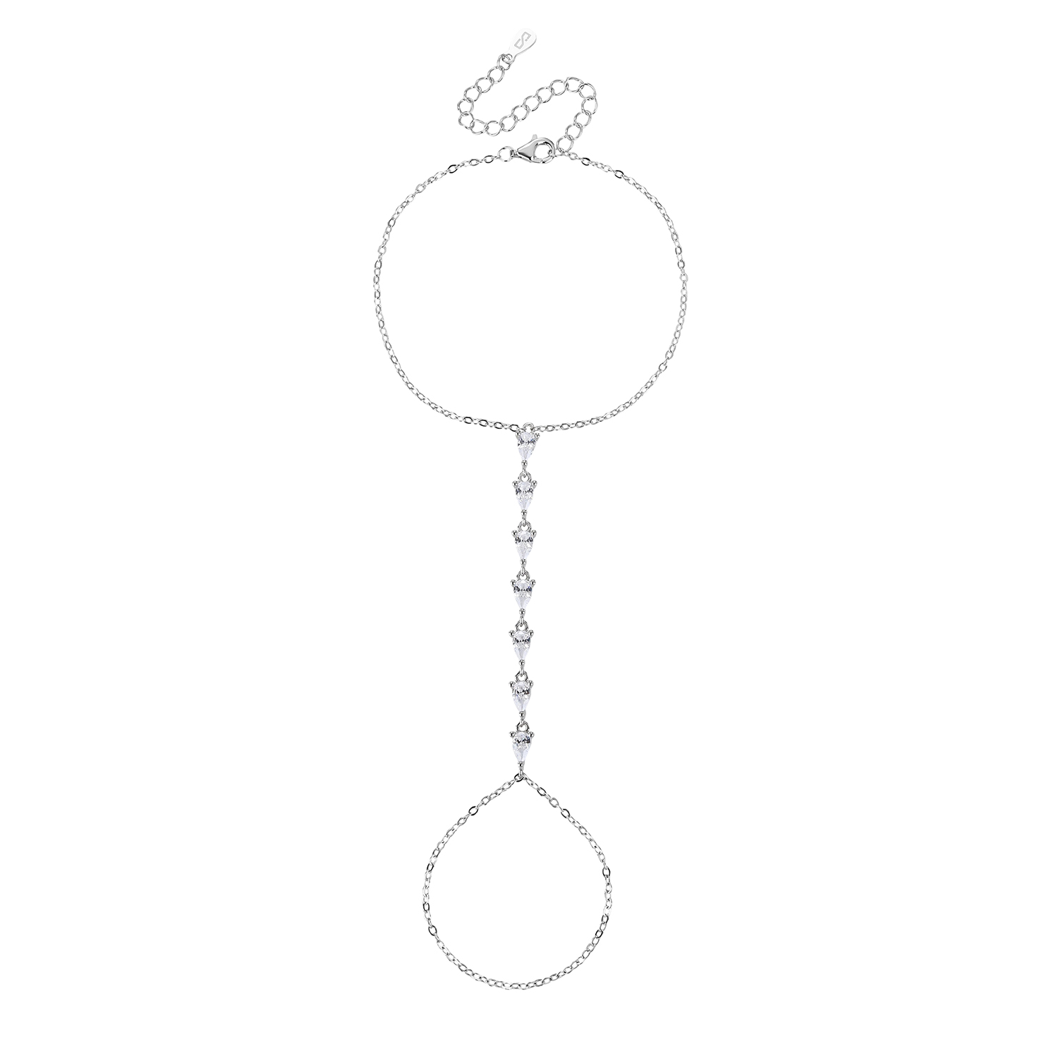 צמיד־טבעת מכסף 925 בעיצוב אלגנטי ונקי, עם שורת אבני זירקון נוצצות הנפרשות לאורך כף היד כמו זרם של אור.