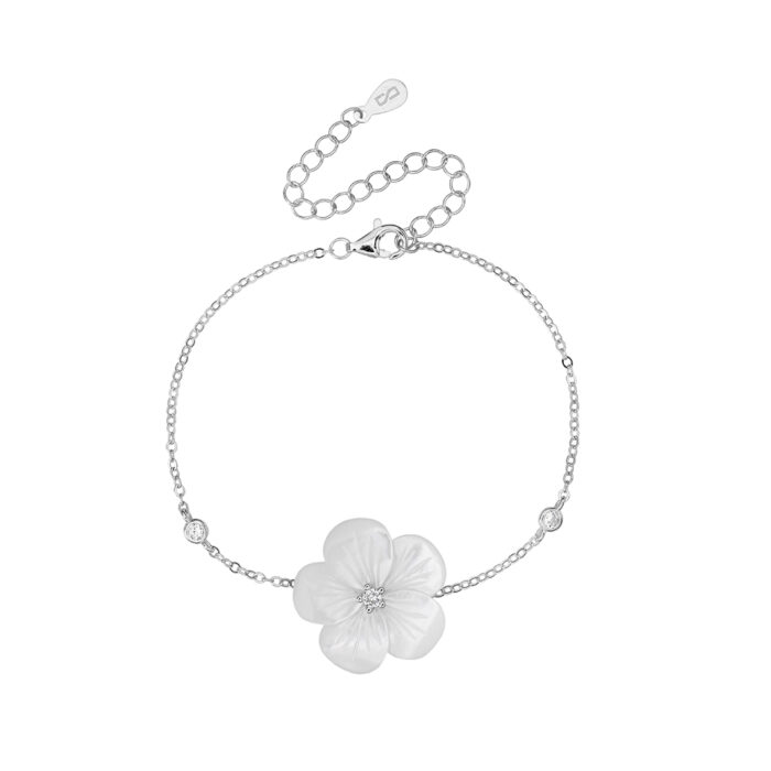 צמיד אלגנטי עם פרח עדין מאם הפנינה, משובץ זירקון מבריק במרכזו, המשתלב בשרשרת כסף עם נגיעות מנצנצות. נגיעה רכה של טבע, קלאסה ונשיות – מושלם ליום יום וגם לאירועים מיוחדים.