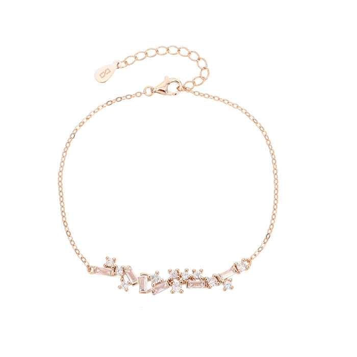 צמיד עדין ונשי עשוי כסף סטרלינג 925,בצבע רוז גולד עם אבני קריסטל שקופות בעיצוב ייחודי ומעודן.