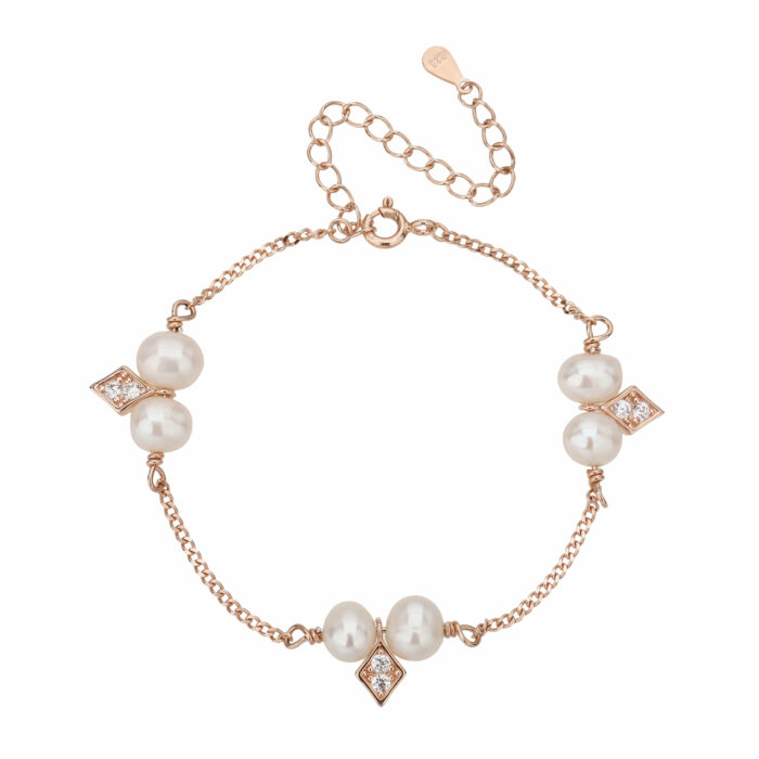 צמיד כסף 925 בצבע רוז גולד יוקרתי המשדר רכות, נשיות וסטייל על-זמני. שילוב מושלם בין פנינים לבנות טבעיות לאבני זירקון מנצנצות, היוצר מראה עדין ואלגנטי שמתאים לכל הופעה – יומיומית או ערב חגיגי.