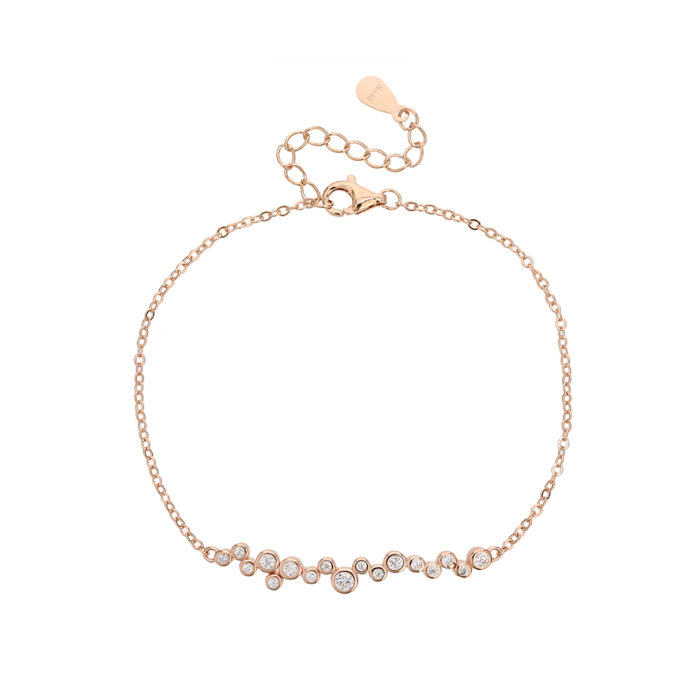 צמיד עדין בציפוי זהב ורוד בעיצוב נשי ומעודן, עם שורת אבני זירקון קטנות המשובצות בעדינות ומפזרות ברק עדין בכל תנועה.