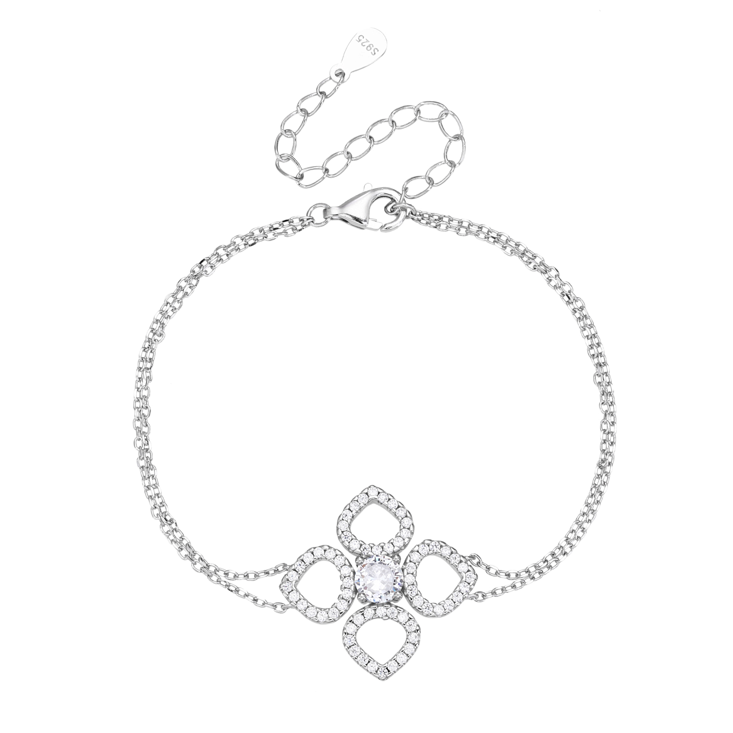 צמיד עדין ומרשים מכסף 925, בעל שרשרת כפולה דקה המשולבת בתליון מרכזי בעיצוב פרח ייחודי. ארבעת עלי הכותרת מעוצבים בצורת טיפה פתוחה, משובצים באבנים קטנות, כשבמרכזם אבן נוצצת עגולה להשלמת המראה. הצמיד כולל שרשרת הארכה וסוגר נוח, ומתאים למראה חגיגי או מתנה מרגשת