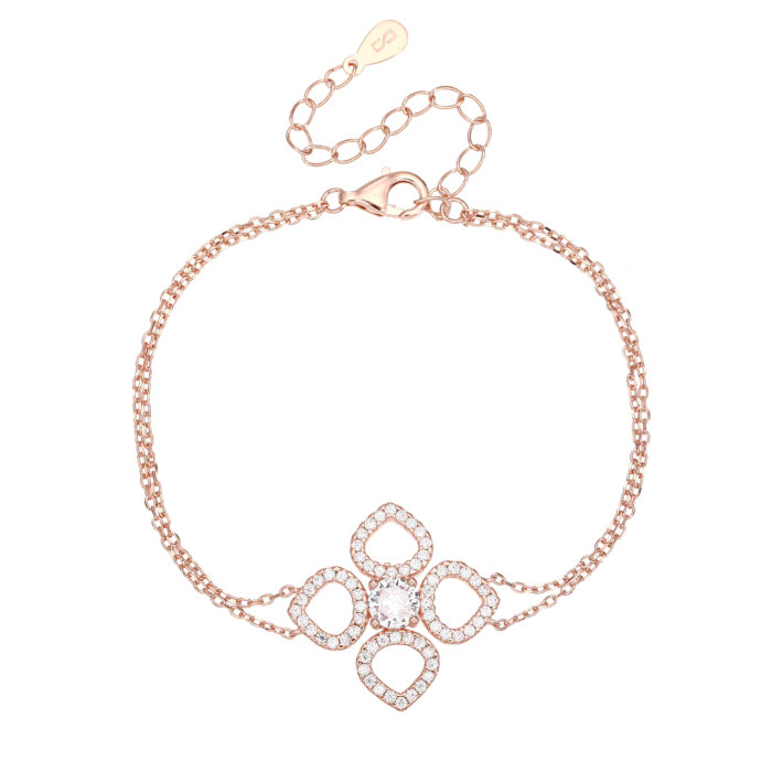 צמיד עדין ומרשים מכסף 925, בעל שרשרת כפולה דקה המשולבת בתליון מרכזי בעיצוב פרח ייחודי. ארבעת עלי הכותרת מעוצבים בצורת טיפה פתוחה, משובצים באבנים קטנות, כשבמרכזם אבן נוצצת עגולה להשלמת המראה. הצמיד כולל שרשרת הארכה וסוגר נוח, ומתאים למראה חגיגי או מתנה מרגשת