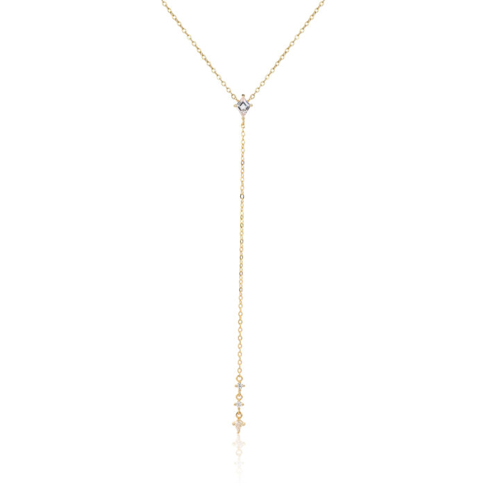 שרשרת כסף 925 בצבע זהב ובעיצוב ארוך ונופל, עם שיבוץ עדין של אבני זירקון נוצצות לאורכה.