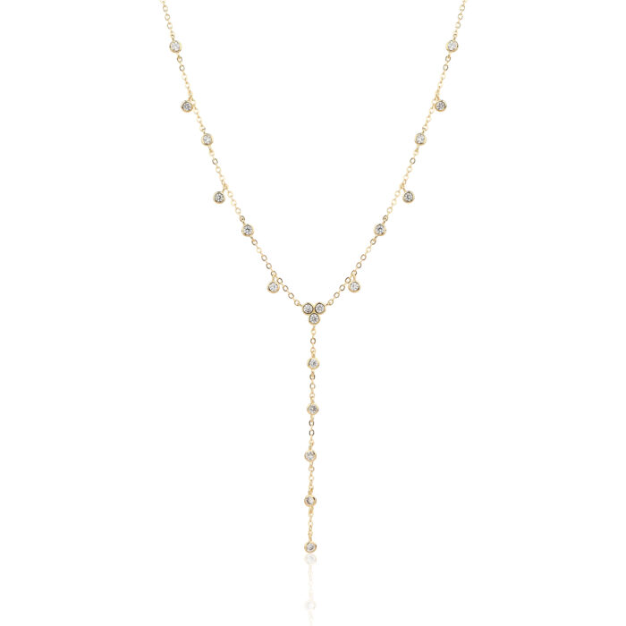 שרשרת ארוכה בציפוי זהב יוקרתי, בעיצוב עדין ונשי עם שיבוץ אבני זירקון קטנות לאורך השרשרת ובתליון הנופל בעדינות על המחשוף.