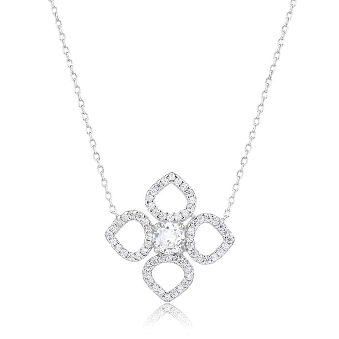 שרשרת כסף 925 יוקרתית עם תליון בצורת פרח מעודן, המשובץ באבני זירקון נוצצות המפיצות אור ייחודי מכל זווית.
