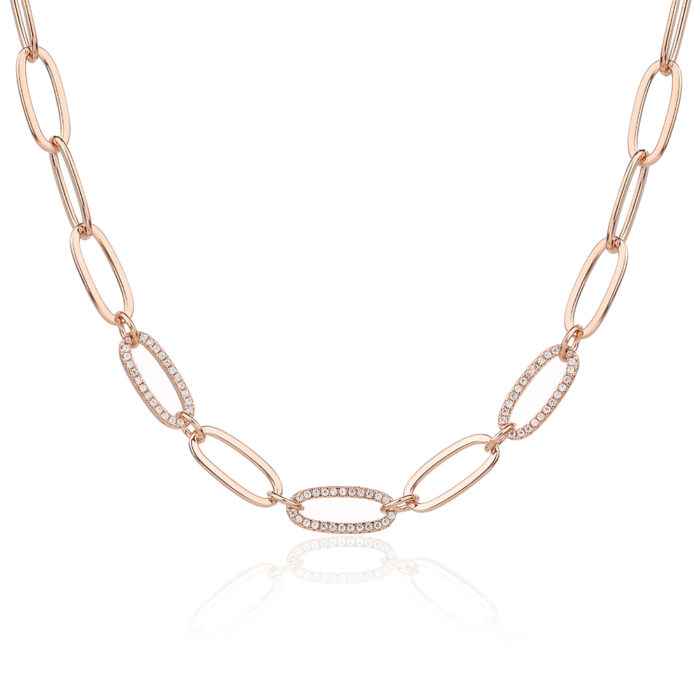 שרשרת מהממת בציפוי זהב ורוד, בעיצוב חוליות אובאליות רחבות בשילוב חוליות משובצות באבני זירקון עדינות, ליצירת מראה מודרני ונוצץ.
