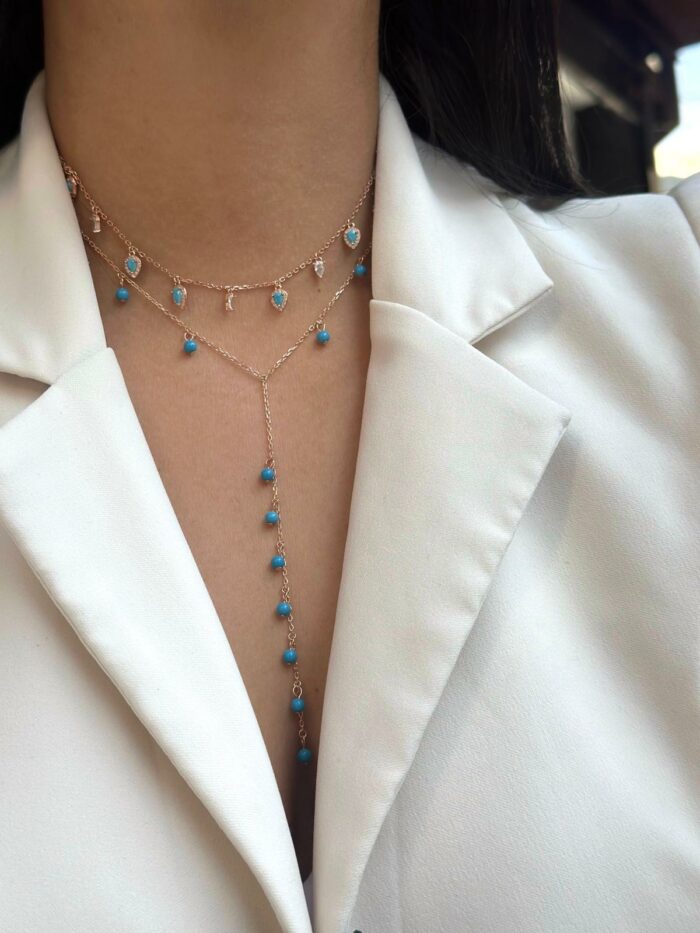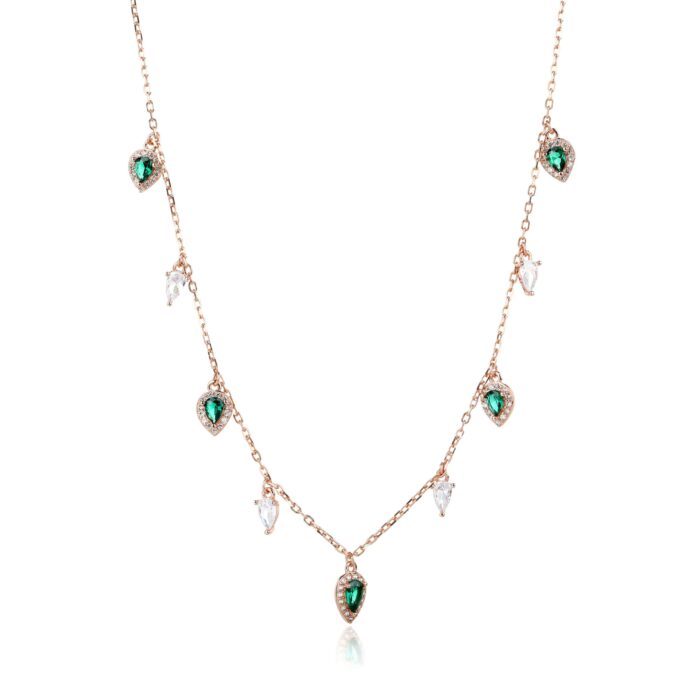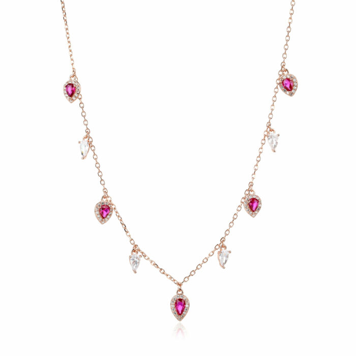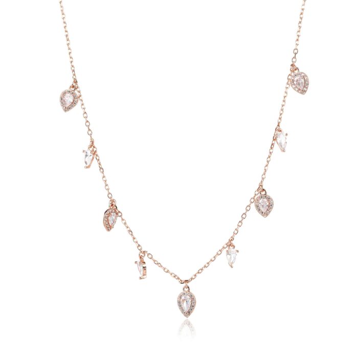 שרשרת עדינה בציפוי זהב ורוד עם תליון טיפות זירקון נוצצות, כל אחת מהן משקפת אור וזוהר מרהיב.