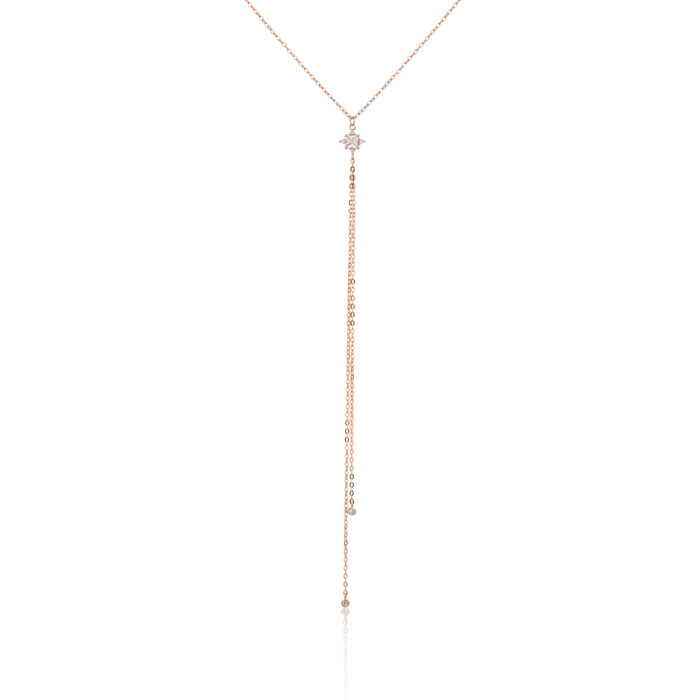 שרשרת כסף 925 בצבע רוז גולד ארוכה ונופלת בעדינות, עם עיטורי זירקון נוצצים המשולבים לאורך השרשרת ומרכז כוכב עדין שמאיר כל תנועה.