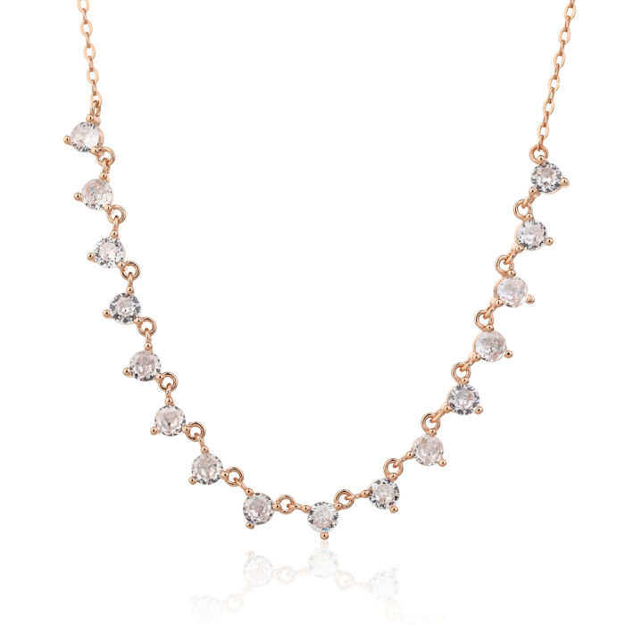 שרשרת כסף 925 בצבע רוז גולד ובעיצוב מרהיב עם שורת אבני זירקון בצורת לב, המשובצות בקפידה ומפיצות ברק עדין ומלא נשיות.