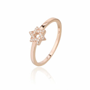 טבעת מגן דוד רוז גולד כסף 925 בעיצוב עדין ומיוחד, בצורת מגן דוד שמוקף באבנים נוצצות קטנות. טבעת זו משלבת מראה רומנטי ונשי עם איכות גבוהה של כסף 925 וציפוי רוז גולד אלגנטי. מתאימה לאירועים מיוחדים או כהשלמה יומיומית לתכשיטים.