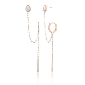 עגילים תלויים מזהב ורוד משובצים אבני זרקון נוצצות בעיצוב מודרני ואלגנטי. כל עגיל מורכב מפיסת טיפה עם הילה נוצצת, המחוברת בשרשרת עדינה לעגיל חישוק מעוטר אבנים. שילוב מושלם של זוהר ועדינות לסטייל ייחודי ומרשים, שישדרג כל הופעה באור רך וזוהר בלתי נשכח.