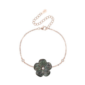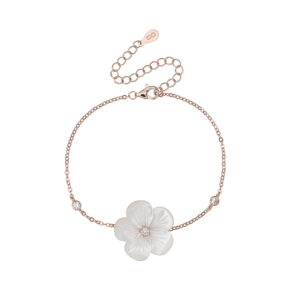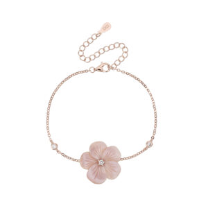 צמיד אלגנטי עם פרח עדין מאם הפנינה, משובץ זירקון מבריק במרכזו, המשתלב בשרשרת זהב ורוד עם נגיעות מנצנצות. נגיעה רכה של טבע, קלאסה ונשיות – מושלם ליום יום וגם לאירועים מיוחדים.